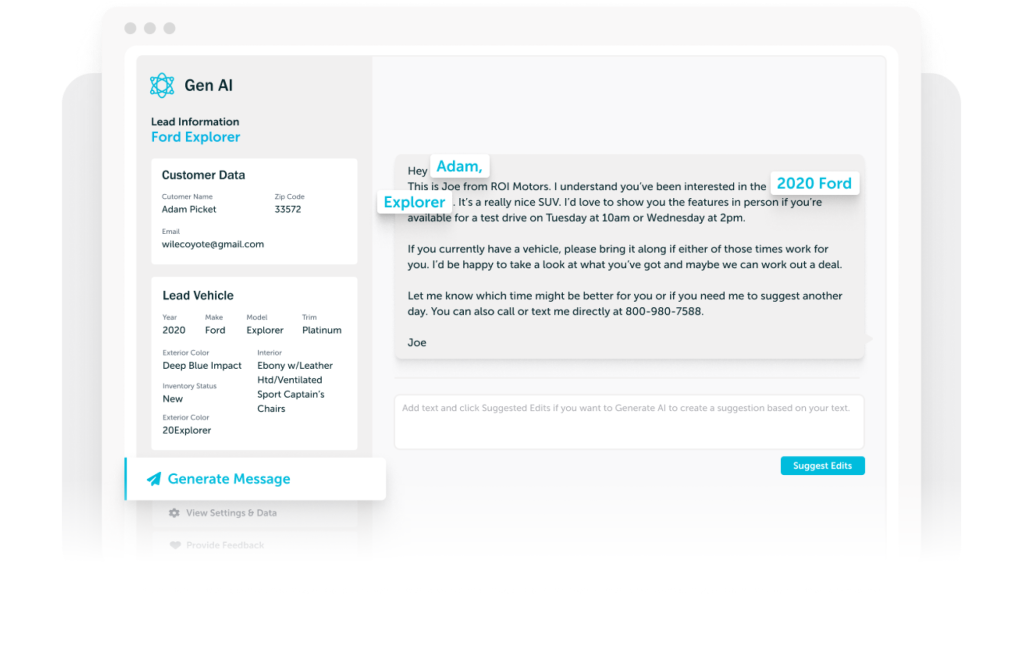 Quickly create engaging, personalized emails and texts with the click of a button that include details such as vehicle of interest, trade in, dealership info and more.